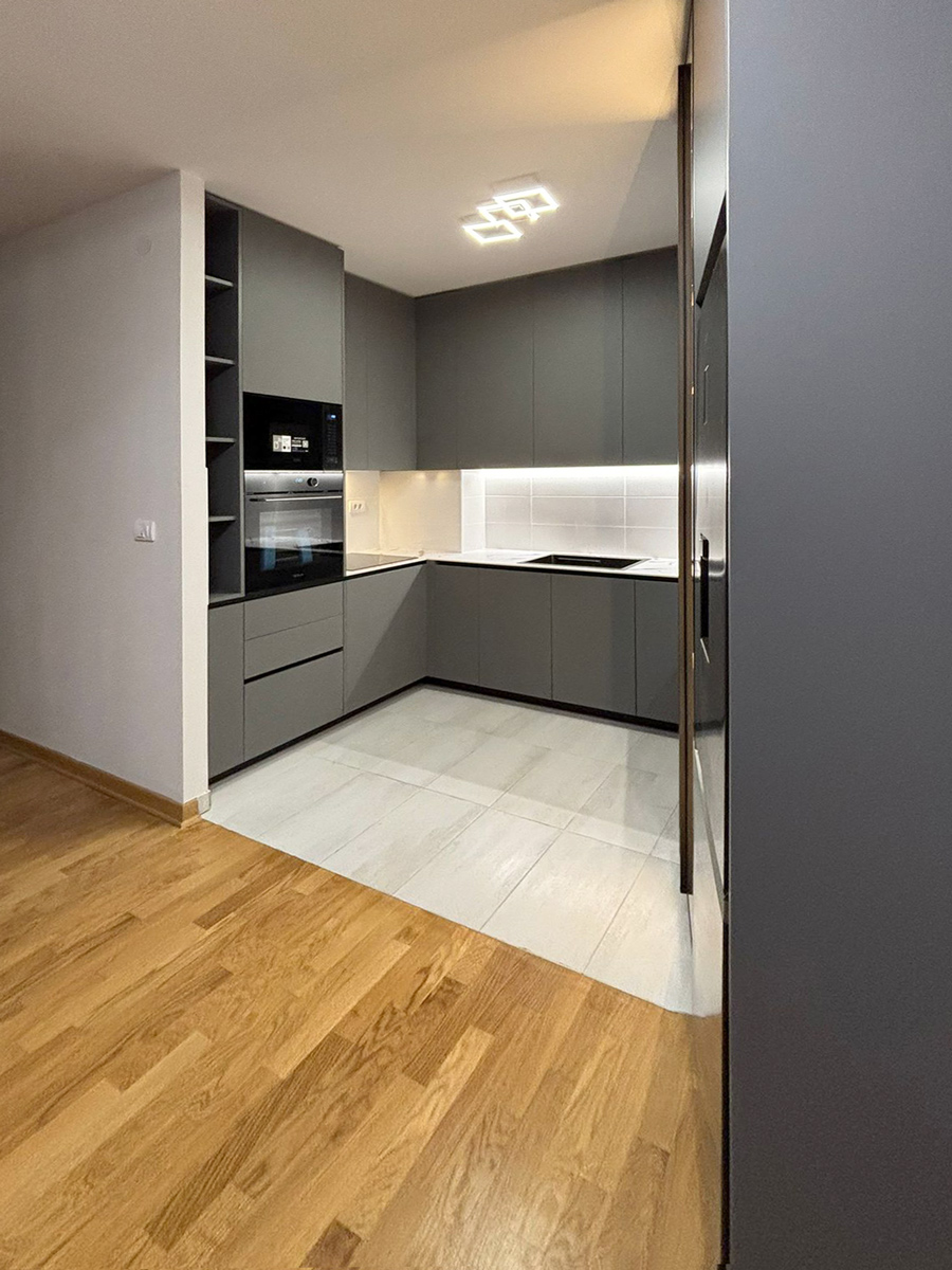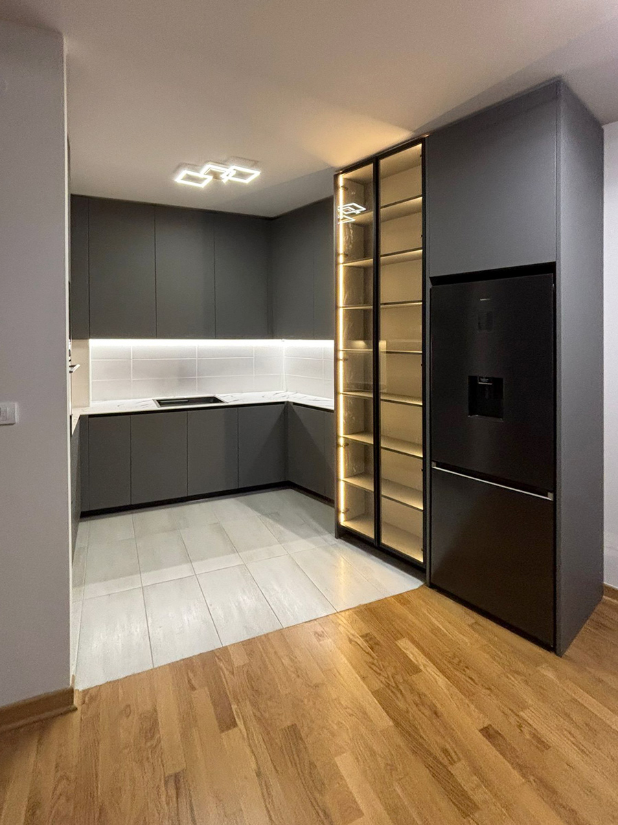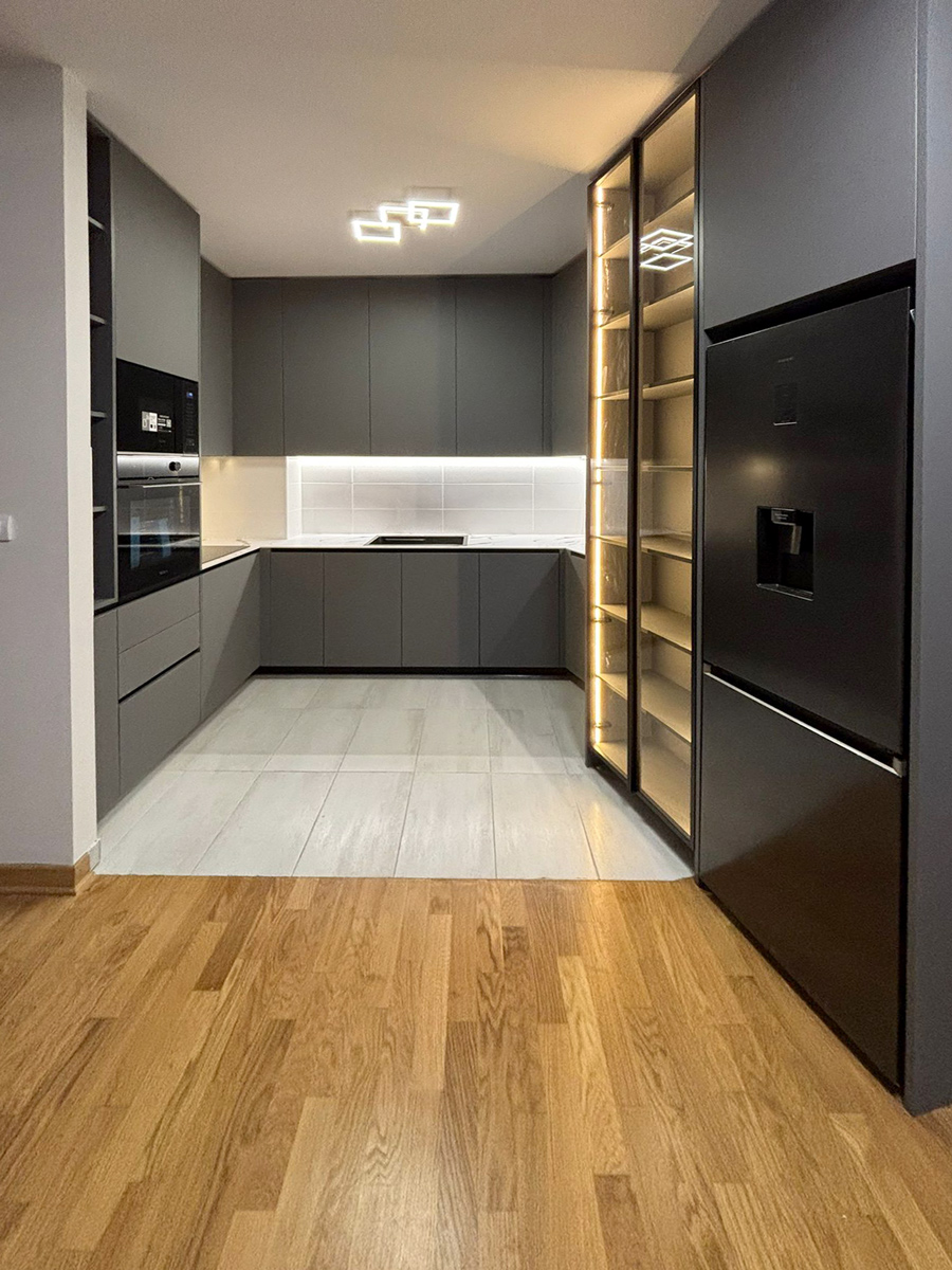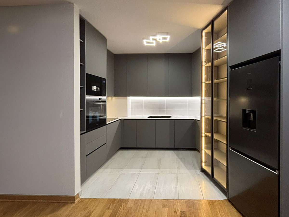 Ova kuhinja nastala je kao odgovor na jedan zahtev — maksimalna funkcionalnost bez vizuelnog šuma. Izrađena po meri prostora, projektovana do poslednjeg detalja, sa jasnim fokusom na ono što zaista treba: red, prostor i trajnost.